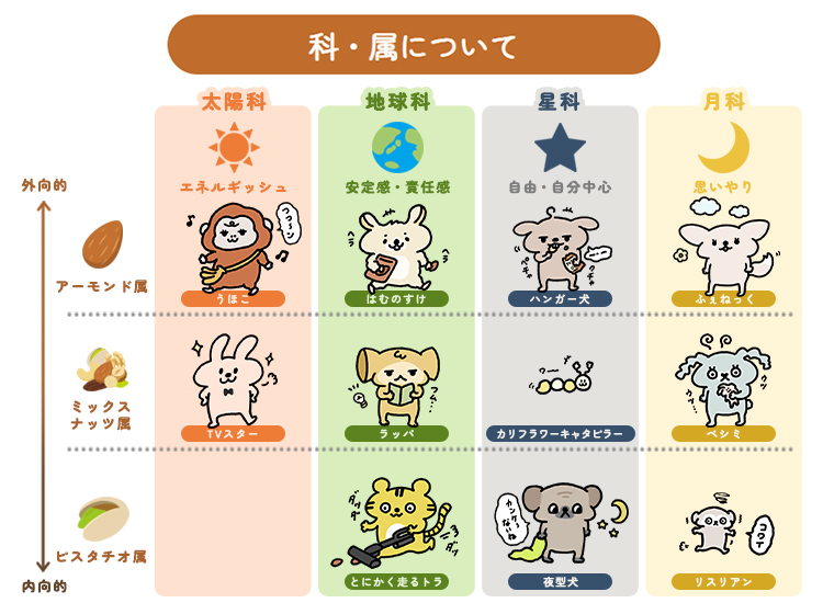 そのため、アーモンド属の中でもエネルギッシュな者は太陽科(うほこ)、思いやりが強い者は月科(ふぇねっく)……といった形で分類することで、より診断結果を細かく分けています。